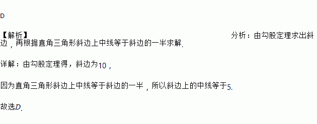 直角三角形两直角边边长分别为6cm和8cm,则斜边的中线为( )