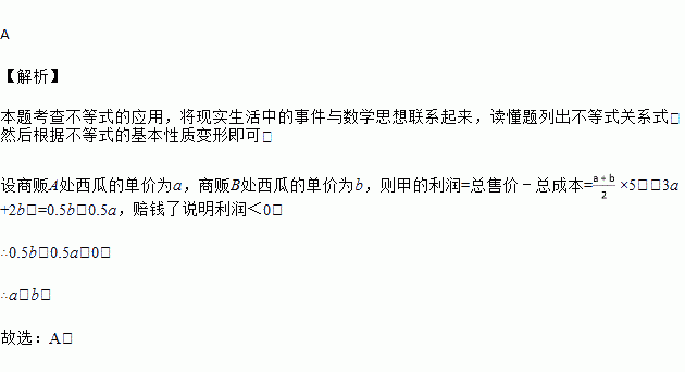 甲从商贩A处购买了若干斤西瓜,又从商贩B处购买了若干斤西瓜.A、B两处所购买的西瓜重量之比为3:2,然后将买回的西瓜以从A、B两处购买单价的平均数为单价全部卖给了乙,结果发现他赔钱了,这是因为( )
