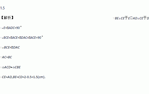 如图,∠ACB=90°,AC=BC,BE⊥CE,AD⊥CE于D,AD=2cm,BE=0.5cm,则DE=________cm.