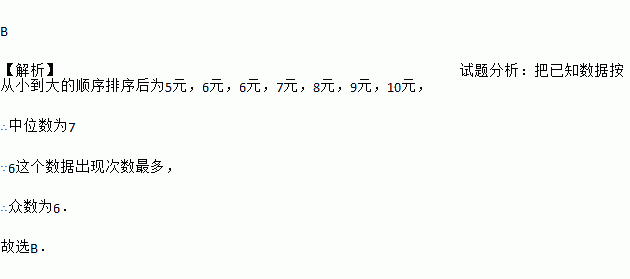 B 【解析】试题分析:把已知数据按从小到大的顺序排序后为5元,6元,6元,7元,8元,9元,10元, ∴中位数为7 ∵6这个数据出现次数最多, ∴众数为6. 故选B.