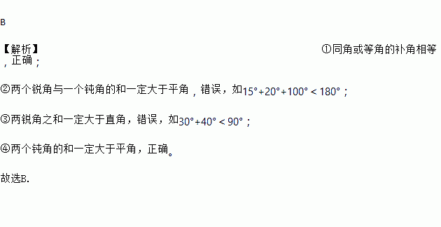 B 【解析】①同角或等角的补角相等,正确; ②两个锐角与一个钝角的和一定大于平角,错误,如15°+20°+100°<180°; ③两锐角之和一定大于直角,错误,如30°+40°<90°; ④两个钝角的和一定大于平角,正确。 故选B.