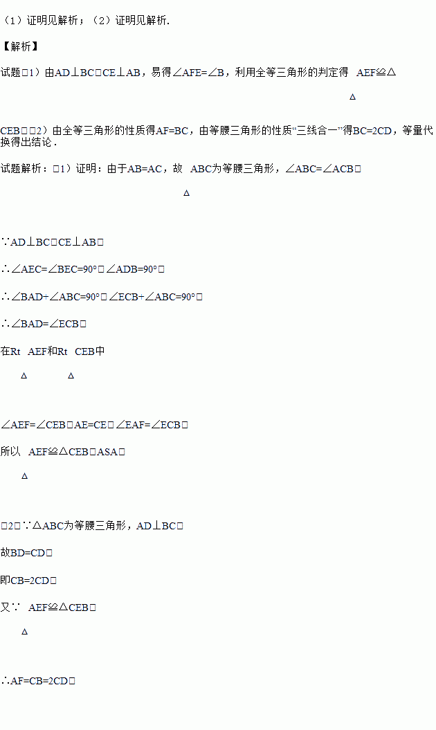 如图,△ABC中,AB=AC,AD⊥BC,CE⊥AB,AE=CE.求证: