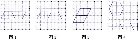 分析:根据平行四边形的中心对称性,先将平行四边形分为两个全等的等腰梯形,再分别将两个等腰梯形范围两个直角梯形(如图1),四个直角梯形可拼成只轴对称的等腰梯形(如图2),可拼成只中心对称的平行四边形(如图3),可拼成一个既是中心对称又是轴对称正六边形或矩形(如图4).