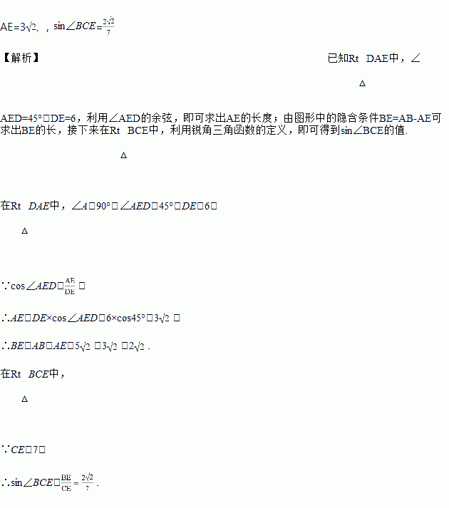 如图,在四边形ABCD中,AD∥BC,∠A=∠B=90°,AB=5,点E在AB上,∠AED=45°,DE=6,CE=7.求AE的长及sin∠BCE的值.