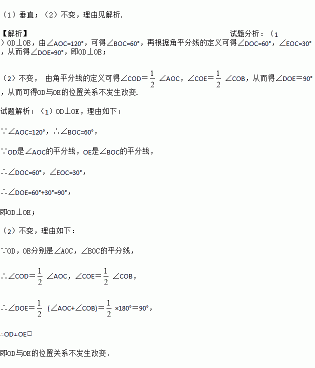 (2)当∠AOC大小发生变化时,OD、OE仍分别是∠AOC、∠BOC的平分线,则OD与OE的位置关系是否改变? 请说明理由.