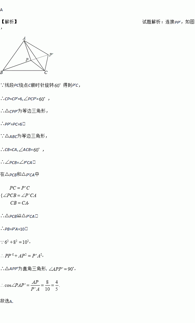 如图,点P在等边△ABC的内部,且PC=6,PA=8,PB=10,将线段PC绕点C顺时针旋转60°得到P'C,连接AP',则cos∠PAP'的值为等于( )