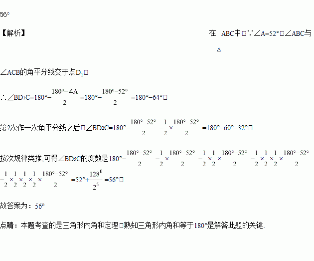 如图,在△ABC中,∠A=52°,∠ABC与∠ACB的平分线交于点D1,∠ABD1与∠ACD1的平分线交于点D2……依此类推,∠BD5C的度数是_______.