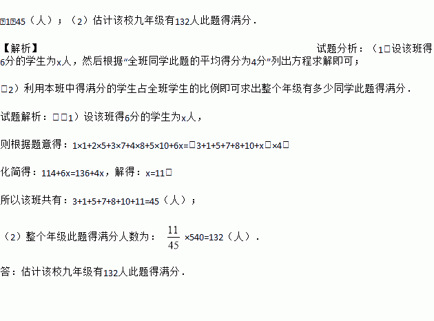(1)45(人);(2)估计该校九年级有132人此题得满分. 【解析】试题分析:(1)设该班得6分的学生为x人,然后根据“全班同学此题的平均得分为4分”列出方程求解即可; (2)利用本班中得满分的学生占全班学生的比例即可求出整个年级有多少同学此题得满分. 试题解析::(1)设该班得6分的学生为x人, 则根据题意得:1×1+2×5+3×7+4×8+5×10+6x=(3+1+5...