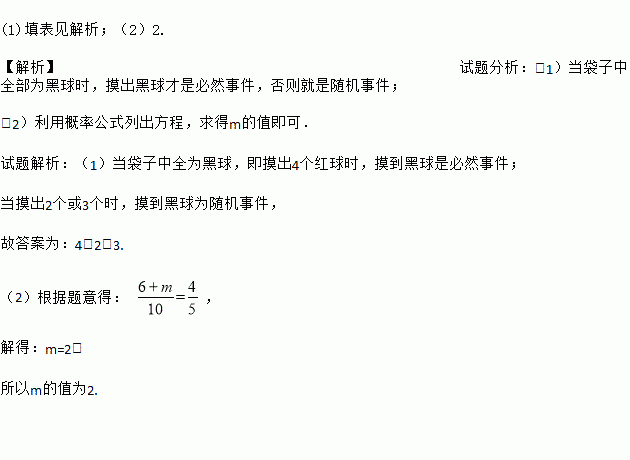 (2)先从袋子中取出m个红球,再放入m个一样的黑球并摇匀,随机摸出1个球是黑球的可能性大小是