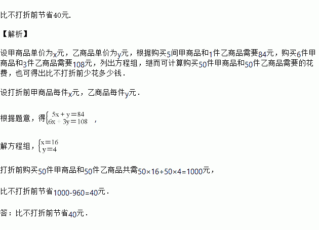 某商场元旦期间举行优惠活动,对甲、乙两种商品实行打折出售,打折前,购买5间甲商品和1件乙商品需要84元,购买6件甲商品和3件乙商品需要108元,元旦优惠打折期间,购买50件甲商品和50件乙商品仅需960元,这比不打折前节省多少钱?