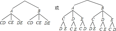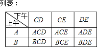 (1)于是爸爸咨询导游后,让小宝上午先从A:太空世界;B:神秘河谷中随机选择一个项目,下午再从C:恐龙半岛;D:儿童王国;E:海螺湾中随机选择两个项目游玩,请用树状图或列表法表示小宝所有可能的选择方式.(用字母表示)