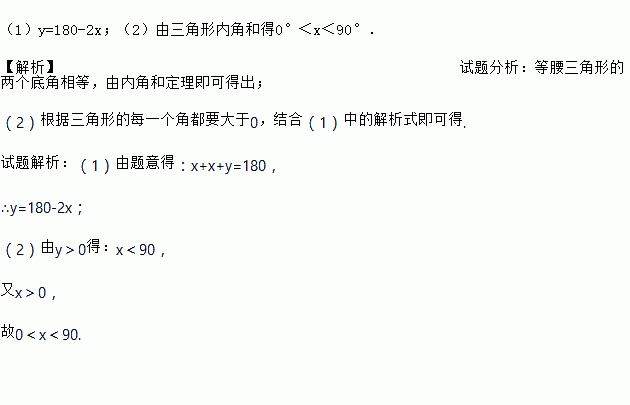 在等腰△ABC中,底角x为(单位:度),顶角y(单位:度).