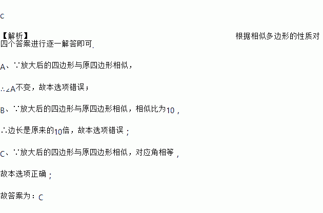 用放大镜看四边形ABCD.若四边形的边长被放大为原来的10倍,则下列结论正确的是( )