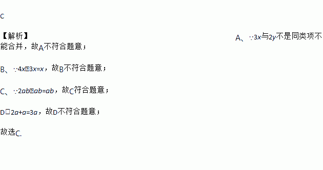 A. 3x+2y=5xy B. 4x﹣3x=1 C. 2ab﹣ab=ab D. 2a+a=2a2