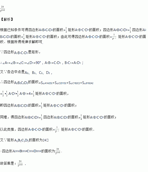 如图:顺次连接矩形A1B1C1D1四边的中点得到四边形A2B2C2D2,再顺次连接四边形A2B2C2D2四边的中点得四边形A3B3C3D3,…,按此规律得到四边形AnBnCnDn.若矩形A1B1C1D1的面积为24,那么四边形A2019B2019C2019D2019的面积为_____.