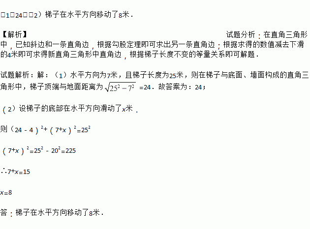 (2)如果梯子的顶端下滑了4米,那么梯子的底部在水平方向滑动了几米?