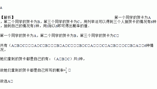 三名同学同一天生日,她们做了一个游戏:买来3张相同的贺卡,各自在其中一张内写上祝福的话,然后放在一起,每人随机拿一张,则她们拿到的贺卡是自己所写的概率是( )