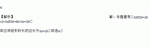 A 【解析】【解析】 依题意有:3a﹣2b+2b×2=3a﹣2b+4b=3a+2b. 故这块矩形较长的边长为3a+2b.故选A.