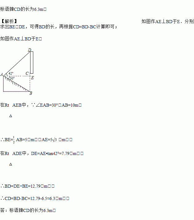 小婷在放学路上,看到隧道上方有一块宣传“中国﹣南亚博览会”的竖直标语牌CD.她在A点测得标语牌顶端D处的仰角为42°,测得隧道底端B处的俯角为30°(B,C,D在同一条直线上),AB=10m,隧道高6.5m(即BC=65m),求标语牌CD的长(结果保留小数点后一位).(参考数据:sin42°≈0.67,cos42°≈0.74,tan42°≈0.90,