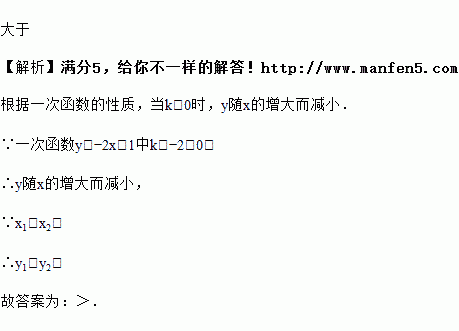 在平面直角坐标系中,已知一次函数y=﹣2x+1的图象经过P1(x1,y1)、P2(x2,y2)两点,若x1<x2,则y1_____y2.(填“>”“<”“=”)