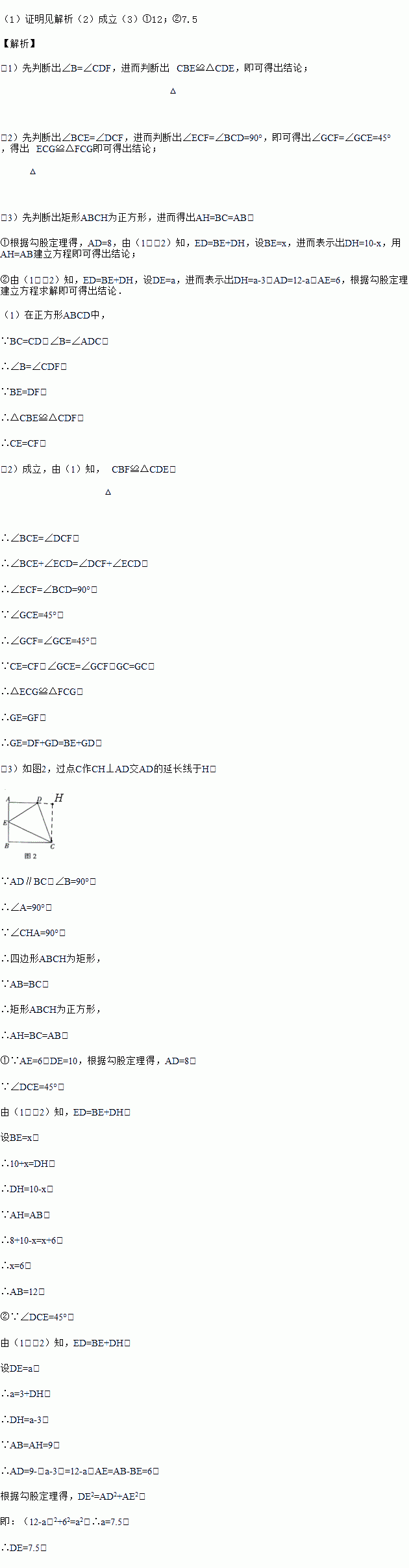 (3)根据你所学的知识,运用(1)、(2)解答中积累的经验,完成下列各题,如图2,在四边形ABCD中,AD∥BC(BC>AD),∠B=90°,AB=BC,且∠DCE=45°.