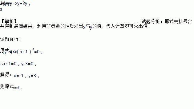 先化简,再求值:3(x2+xy)-3x2+y-(2xy-y),其中x、y满足|y–3|+(x+1)2=0.