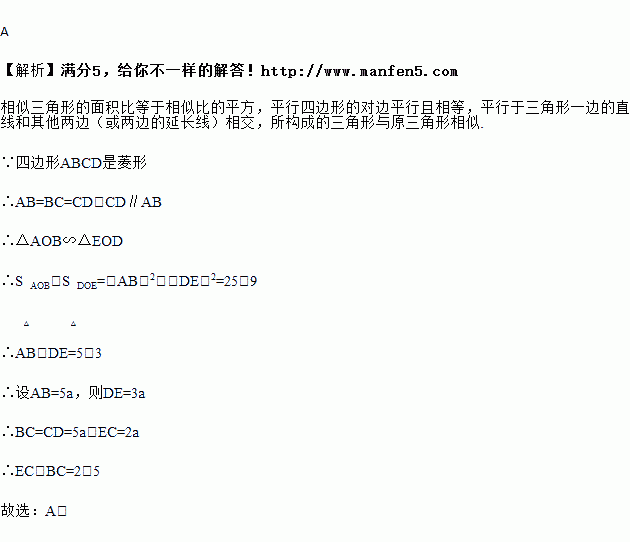 如图,在菱形ABCD中,E为CD上一点,连接AE、BD,交于点O,若S△AOB:S△DOE=25:9,则CE:BC等于( )