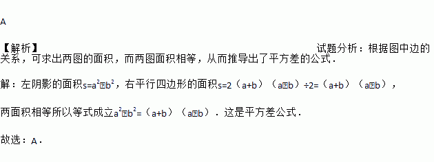 A 【解析】试题分析:根据图中边的关系,可求出两图的面积,而两图面积相等,从而推导出了平方差的公式. 【解析】 左阴影的面积s=a2﹣b2,右平行四边形的面积s=2(a+b)(a﹣b)÷2=(a+b)(a﹣b), 两面积相等所以等式成立a2﹣b2=(a+b)(a﹣b).这是平方差公式. 故选:A.