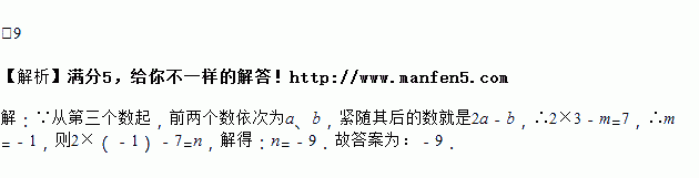 一组数:2,1,3,m,7,n,…满足“从第三个数起,前两个数依次为a、b,紧随其后的数就是2a-b”,例如这组数中的第三个数“3”是由“2×2-1”得到的,那么这组数中n表示的数为______________.