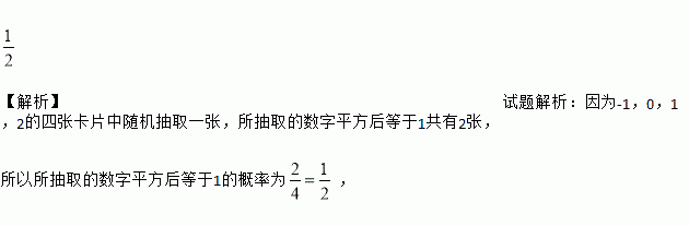 【解析】试题解析:因为-1,0,1,2的四张卡片中随机抽取一张,所抽取的数字平方后等于1共有2张, 所以所抽取的数字平方后等于1的概率为,