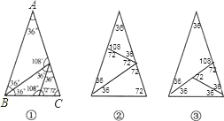 已知△ABC中,AB=AC,∠A=36°,仿照图①,请你再设计两种不同的分法,将△ABC分割成3个三角形,使得每个三角形都是等腰三角形.