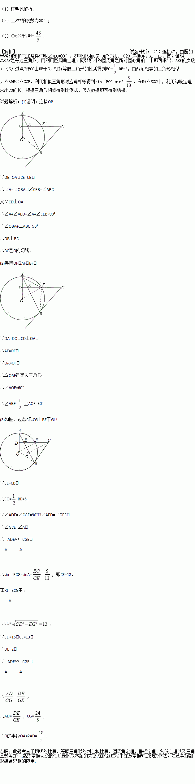 (3)如果CD=15,BE=10,sinA=