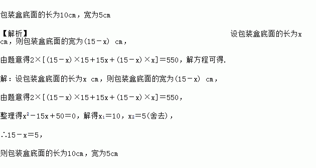 将表面积为550 cm2的包装盒剪开铺平,纸样如图所示,包装盒的高为15 cm,求出包装盒底面的长与宽.