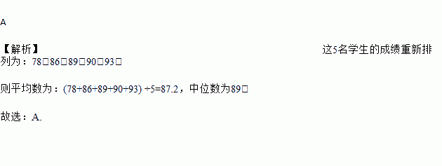 一次数学检测中,有5名学生的成绩分别是86,89,78,93,90.则这5名学生成绩的平均分和中位数分别是( )
