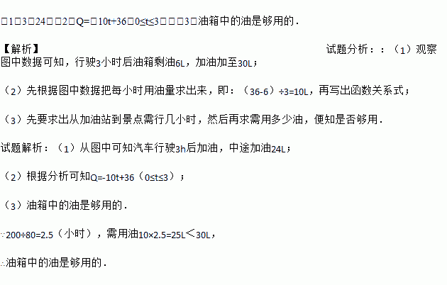 (3)如果小汽车在行驶过程中耗油量速度不变,加油站距景点200km,车速80km/h,要到达目的地,油箱中的油是否够用?请说明理由