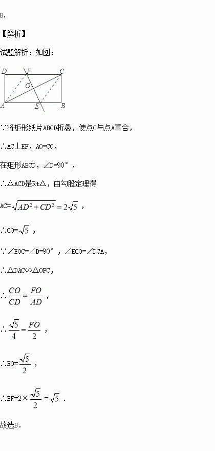 如图,将矩形纸片ABCD折叠,使点A与点C重合,折痕为EF,若AB=4,BC=2,那么线段EF的长为( )
