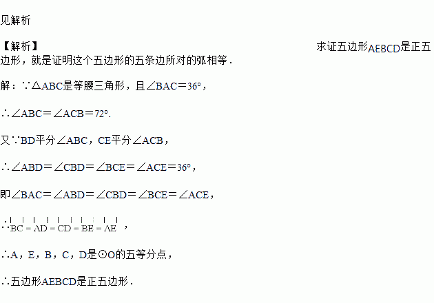 如图1所示,已知△ABC是⊙O的内接等腰三角形,顶角∠BAC=36°,弦BD,CE分别平分∠ABC,∠ACB.求证:五边形AEBCD是正五边形.