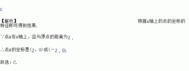 点A在x轴上,且到坐标原点的距离为2,则点A的坐标为( )