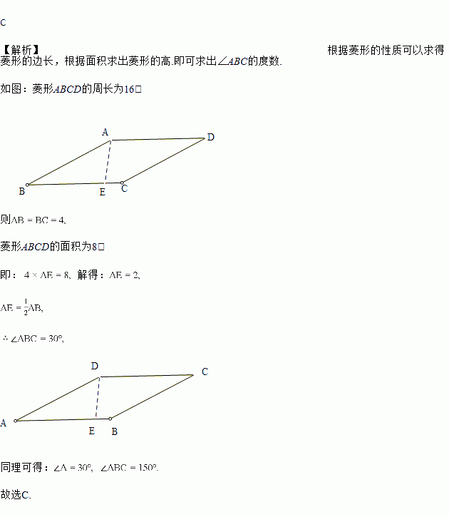 若菱形ABCD的周长为16,面积为8,则∠ABC的度数为( )