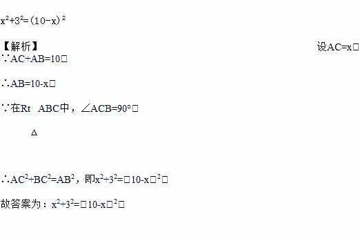 《九章算术》是我国古代最重要的数学著作之一,在“勾股”章中记载了一道“折竹抵地”问题:“今有竹高一丈,末折抵地,去本三尺,问折者高几何?”翻译成数学问题是:如图所示,△ABC中,∠ACB=90°,AC+AB=10,BC=3,求AC的长.如果设AC=x,可列出的方程为________________.