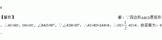 如图,矩形ABCD的对角线AC和BD相交于点O,∠ADB=30°,AB=4,则 OC=_____.