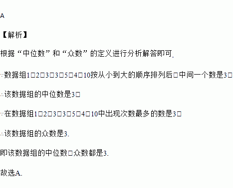 一组数据1,2,3,3,5,4,10的中位数与众数分别是 ( )