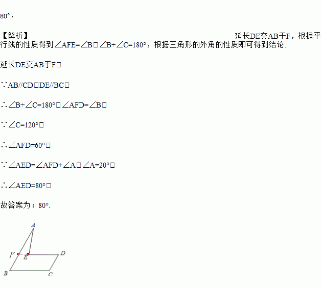 如图,已知AB∥CD,BC∥DE.若∠A=20°,∠C=120°,则∠AED的度数是________ .