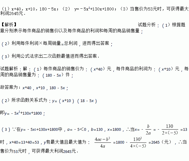 某商品的进货价为每件30元,为了合理定价,先投放市场试销.据市场调查,销售价为每件40元时,每周的销售量是180件,而销售价每上涨1元,则每周的销售量就会减少5件,设每件商品的销售价上涨x元,每周的销售利润为y元.