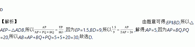 D 【解析】由题意可得:EP∥BD,所以△AEP∽△ADB,所以,因为EP=1.5,BD=9,所以,解得:AP=5,因为AP=BQ,PQ=20,所以AB=AP+BQ+PQ=5+5+20=30,故选D.