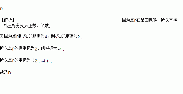 已知点P在第四象限,且到x轴的距离为4,到y轴的距离是2,则点P的坐标为( )