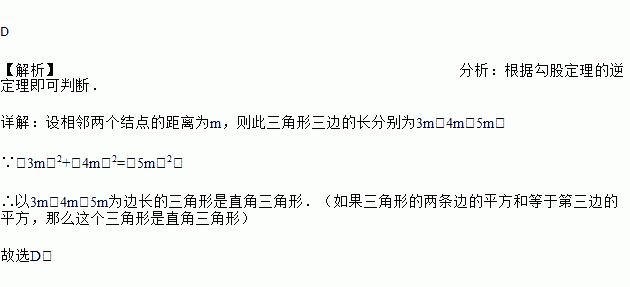古埃及人曾经用如图所示的方法画直角:把一根长绳打上等距离的13个结,然后以3个结间距、4个结间距、5个结间距的长度为边长,用木桩钉成一个三角形,其中一个角便是直角,这样做的道理是( )