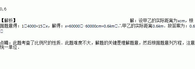 比例尺为1:4000的地图上,量得甲乙两地的距离15cm,则甲乙的实际距离是_________km.