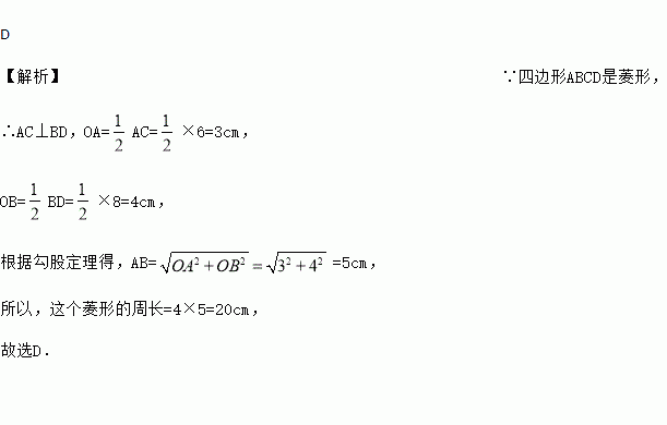 如图,菱形ABCD的对角线AC,BD的长分别为6cm,8cm,则这个菱形的周长为( )