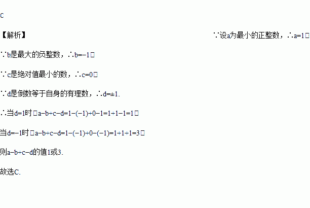 设a为最小的正整数,b是最大的负整数,c是绝对值最小的数,d是倒数等于自身的有理数,则a-b+c-d的值为( )